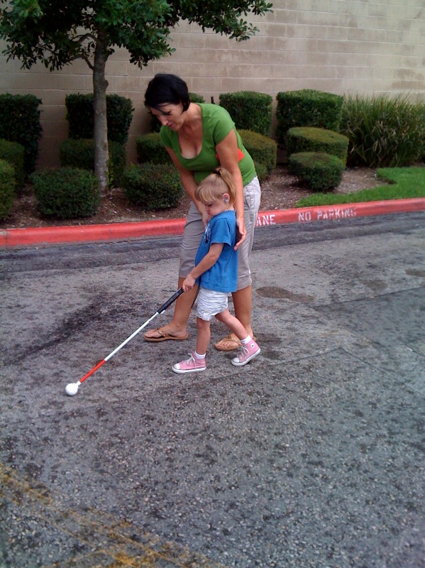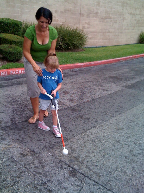 This is a big day. Lauren's summertime Orientation and Mobility teacher, Amy Tange, decided to try to teach Lauren how to use a cane. Lauren is already an independent little spirit. Using a cane is big step toward being -safe- and independent.